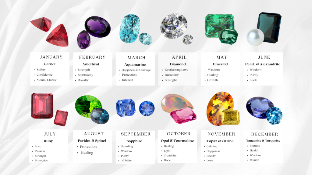 We all struggle with finding the perfect birthday gift for our loved ones. Birthstones are one way to surprise someone with a thoughtful and fitting present. Regardless of gender, age, nationality, or religion, birthstones resonate with people, making them highly appealing. Each birth month has one or more birthstones to choose from. Birthstones are surrounded by myths and legends about their powers, properties, and attributes. Below is a chart displaying the birthstones associated with each month and their attributes.
