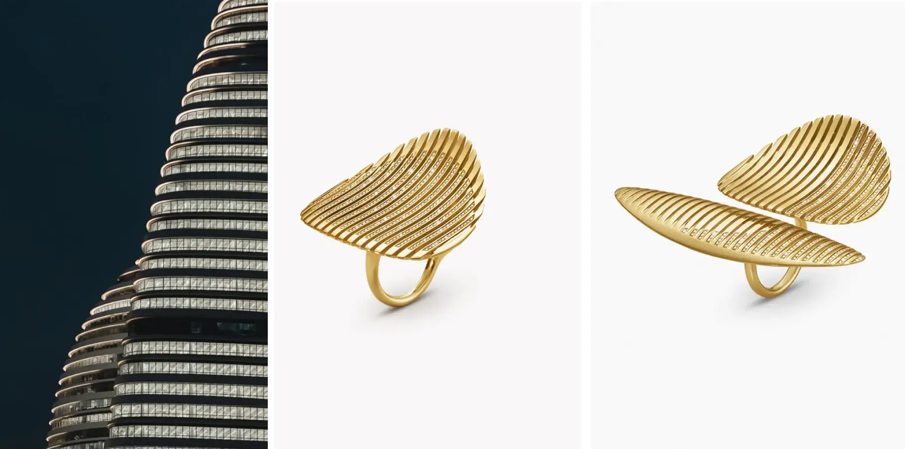 On the left: Wangjing SOHO, Beijing; on the right: Left- ring in 18-carat yellow gold with brilliant cut diamonds from Zaha Hadid’s collection for Georg Jensen
